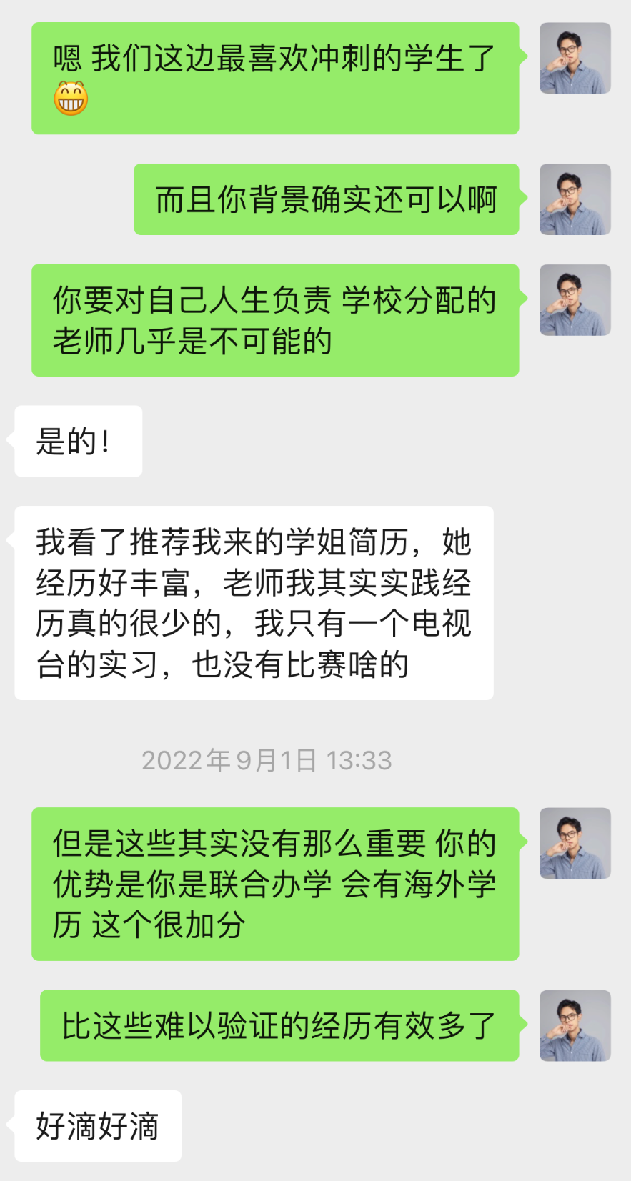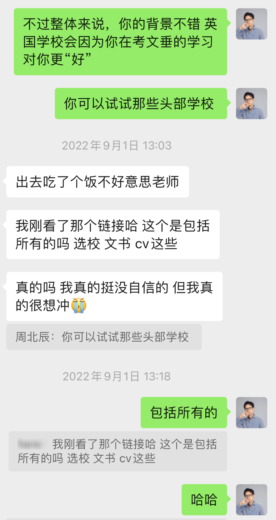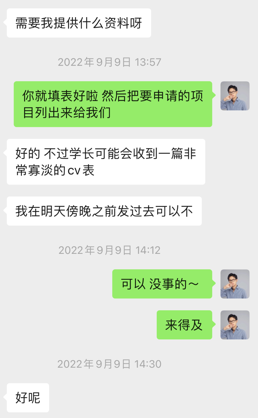 我在申请的过程中一波三折,发argue信就发了好几次。姐姐和学长每一次都帮我写好让我看一下再发送,我有时候真的很不好意思! 尤其是因为我上学期成绩单的问题,那段时间真的很丧,觉得好的学校与我无缘,所以只敢偷偷的和北辰学长私聊了这件事情,他给了我很大的鼓励,让我相信自己,后来事情也顺利解决,我也如愿收到了offer!