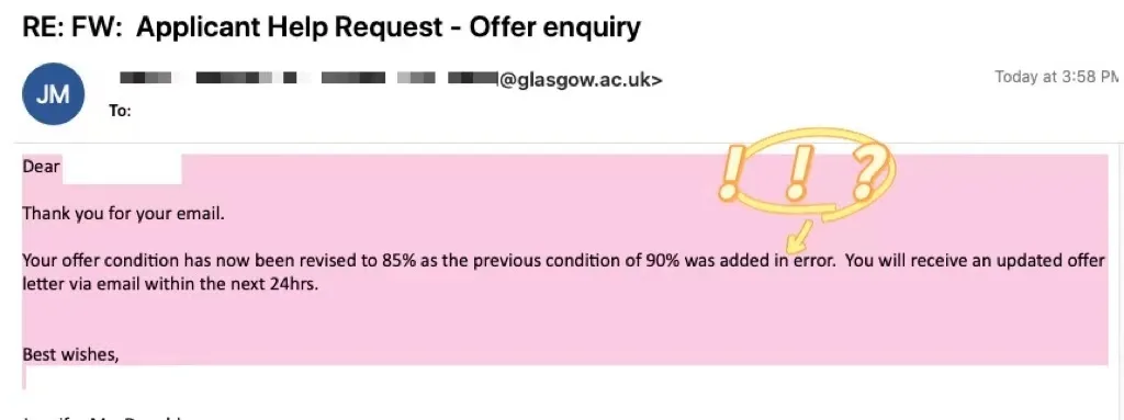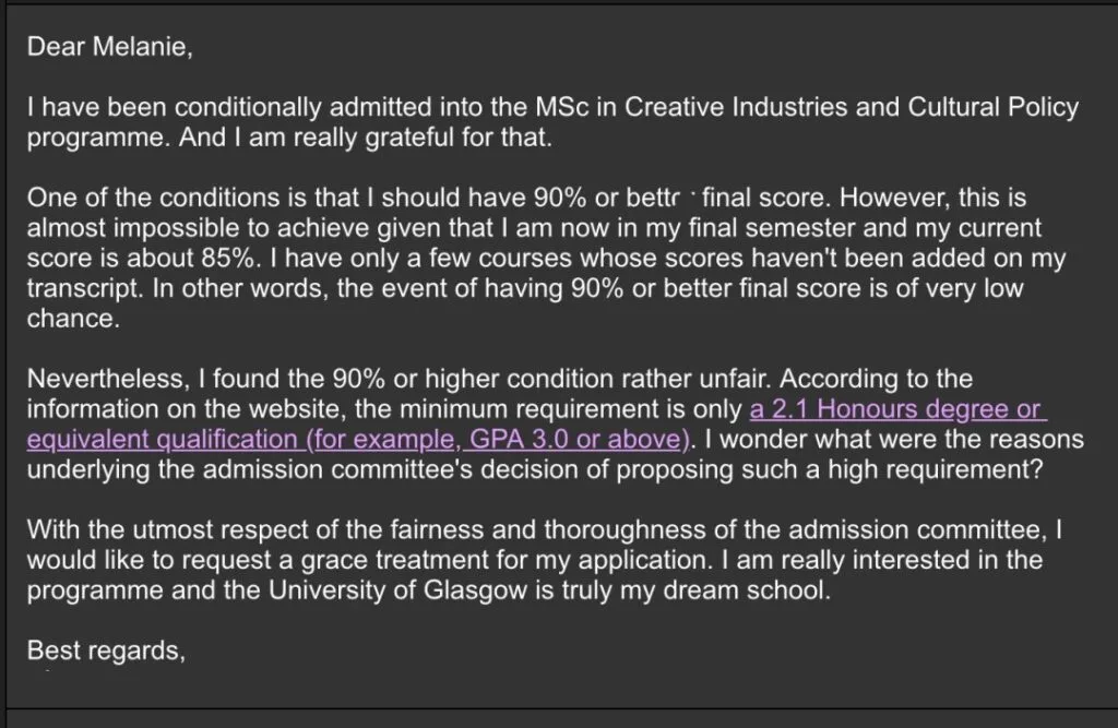 曾经我们有一个同学拿到了格拉斯哥大学的 offer,学校给的条件是毕业均分达到 90 分以上。但是学生当时虽然还没有毕业,但是所有的课程成绩都出来了,就只有 85 分。所以要想去格拉斯哥,我们就只能 argue。我们查阅了官网的要求和对中国学校分数的划分,发现其实不应该要求这么高分。我们把我们的理由邮件给了招生办公室,对方的回复让我们大吃一惊。