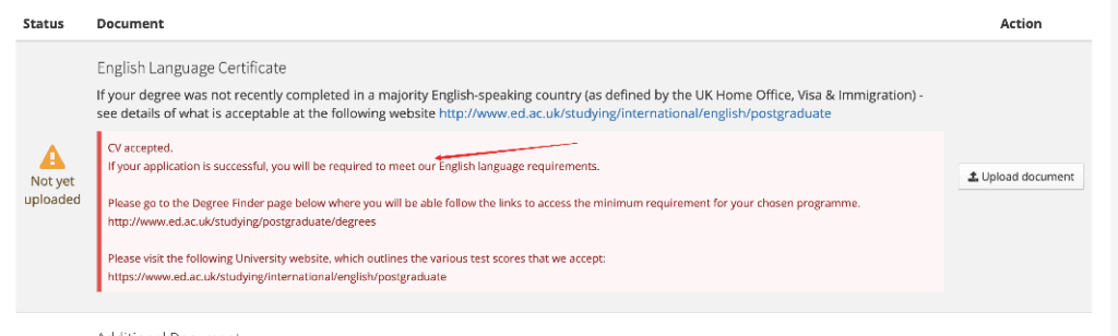 但是有个时候,如果你在上传英语成绩的那一栏没有上传文件,有的申请系统会显示材料不全。比如爱丁堡大学的申请系统,本来不需要英语成绩的,但是却提醒你文件未上传。
