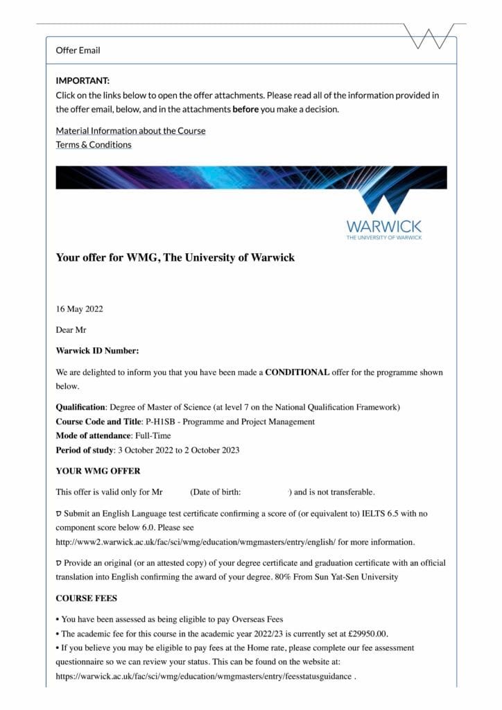 Offer展示University of Warwick华威大学录取的项目:MSc Programme and Project Management (PPM)(https://warwick.ac.uk/fac/sci/wmg/education/wmgmasters/courses/masters_project_management )