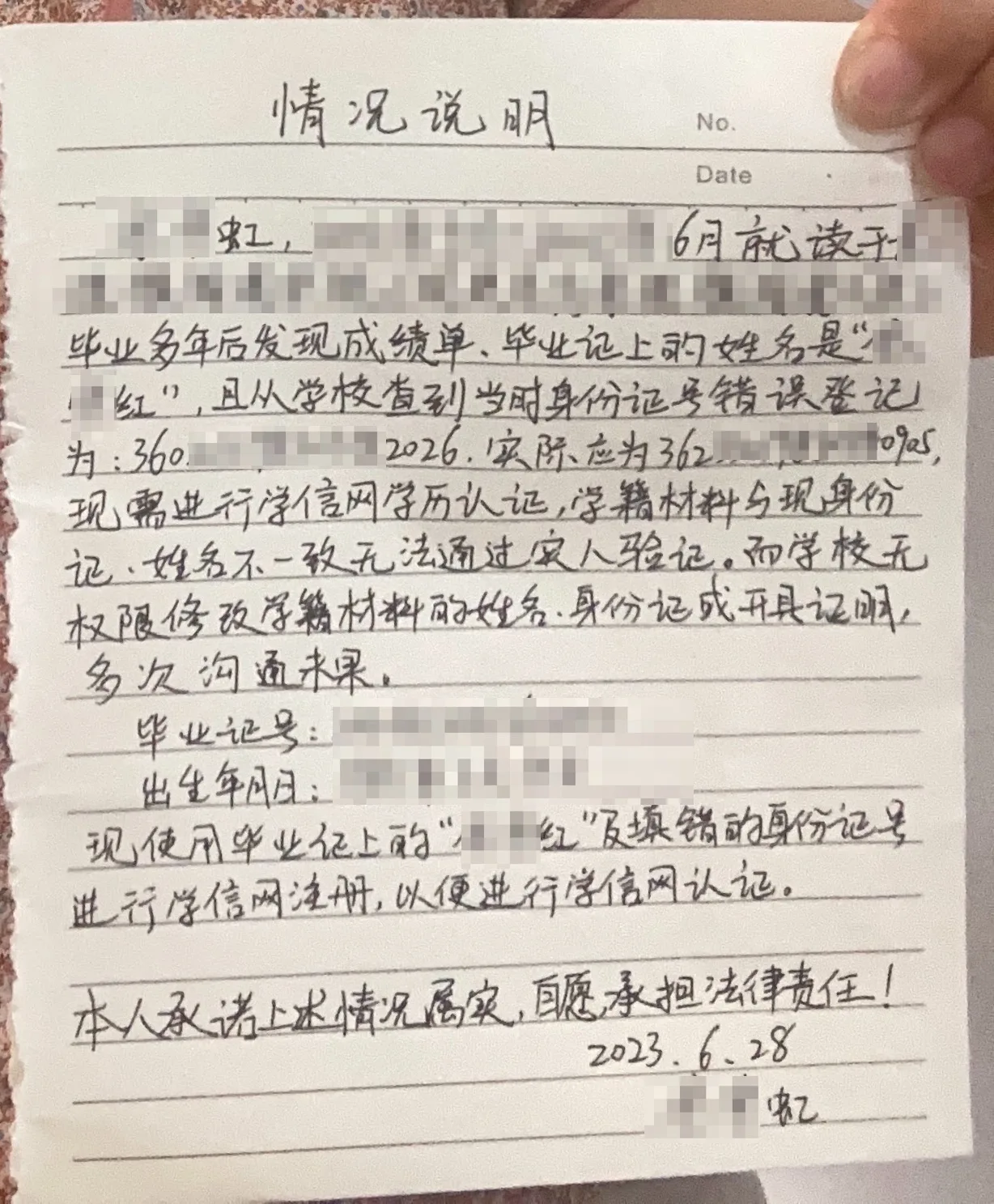 所以,我们需要写一个情况说明,告诉学信网这个情况,帮我们把账户里面的名字改成”红“。这样,我们的账户里面就有了”红“的学历信息了。