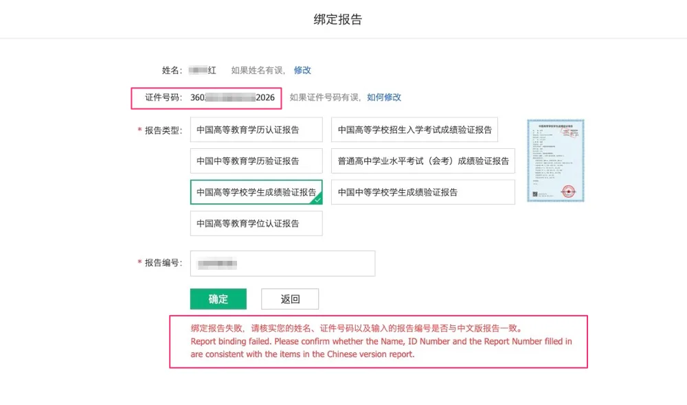 这个账号的名字虽然是”红“,但是身份证号码和成绩单的身份证号码不一致,导致无法绑定。