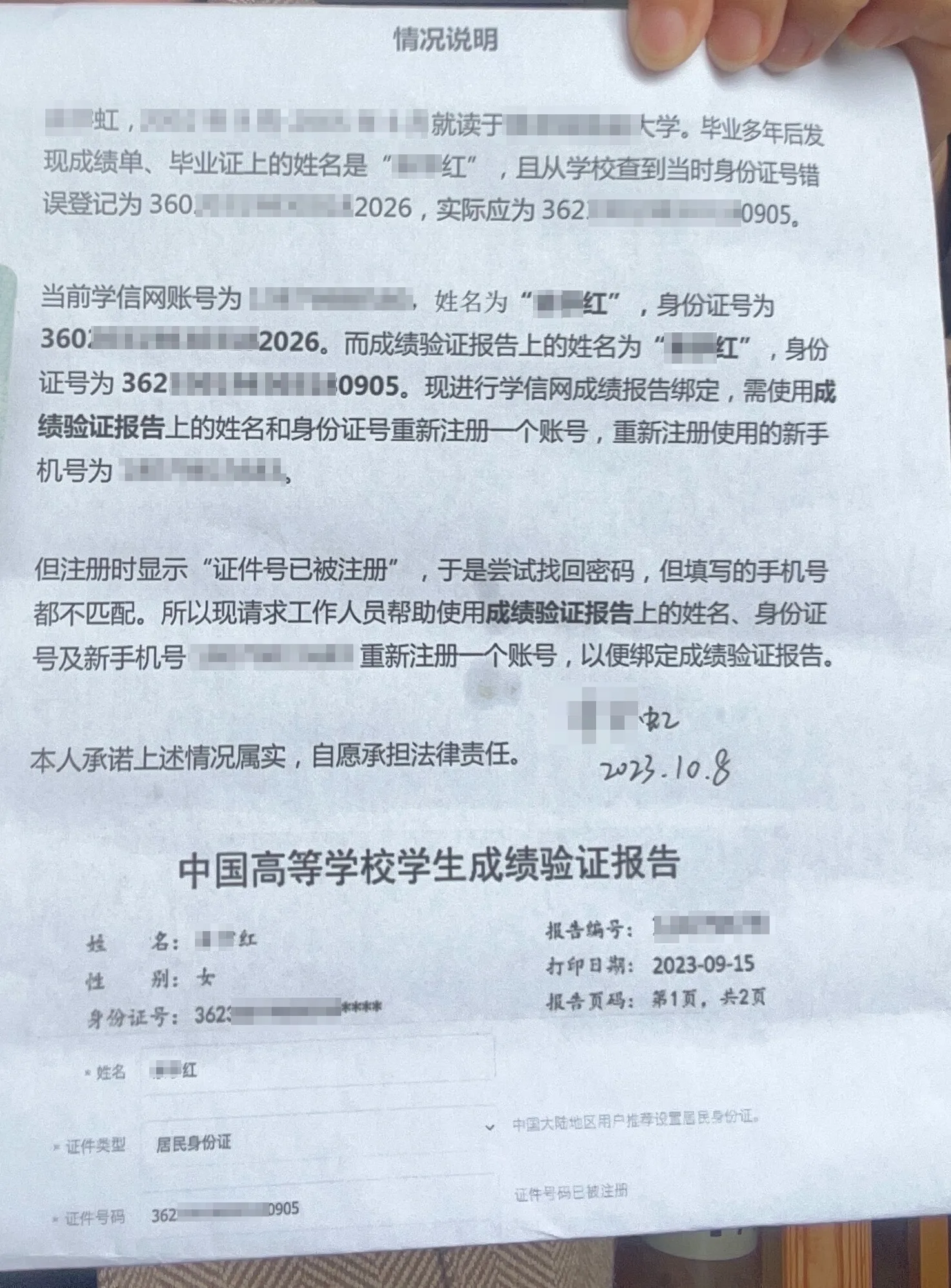 我们猜测,其实一开始这个成绩单的名字和身份证号码可以全部改过来的,但是我们没有明确和学信网提出要求,所以学信网没有这么做。